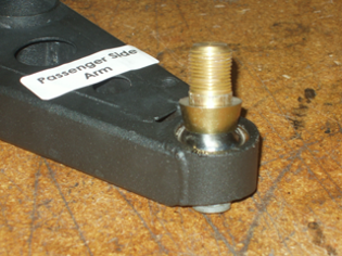 The picture above shows the pin in the arm with the spacer slipped over the pin. It clearly illustrates that the spacer is installed with the small end of the spacer in contact with the bearing. It also illustrates that the spacer is installed so that it sits above the arm, and the 12-point nut, which is barely visible at the bottom of the pin, is recessed in the bearing housing lower cup. DO NOT install the arm upside down as this would position the spacer incorrectly in the “cup” and binding would occur. It must look as it does in the picture above when assembled.